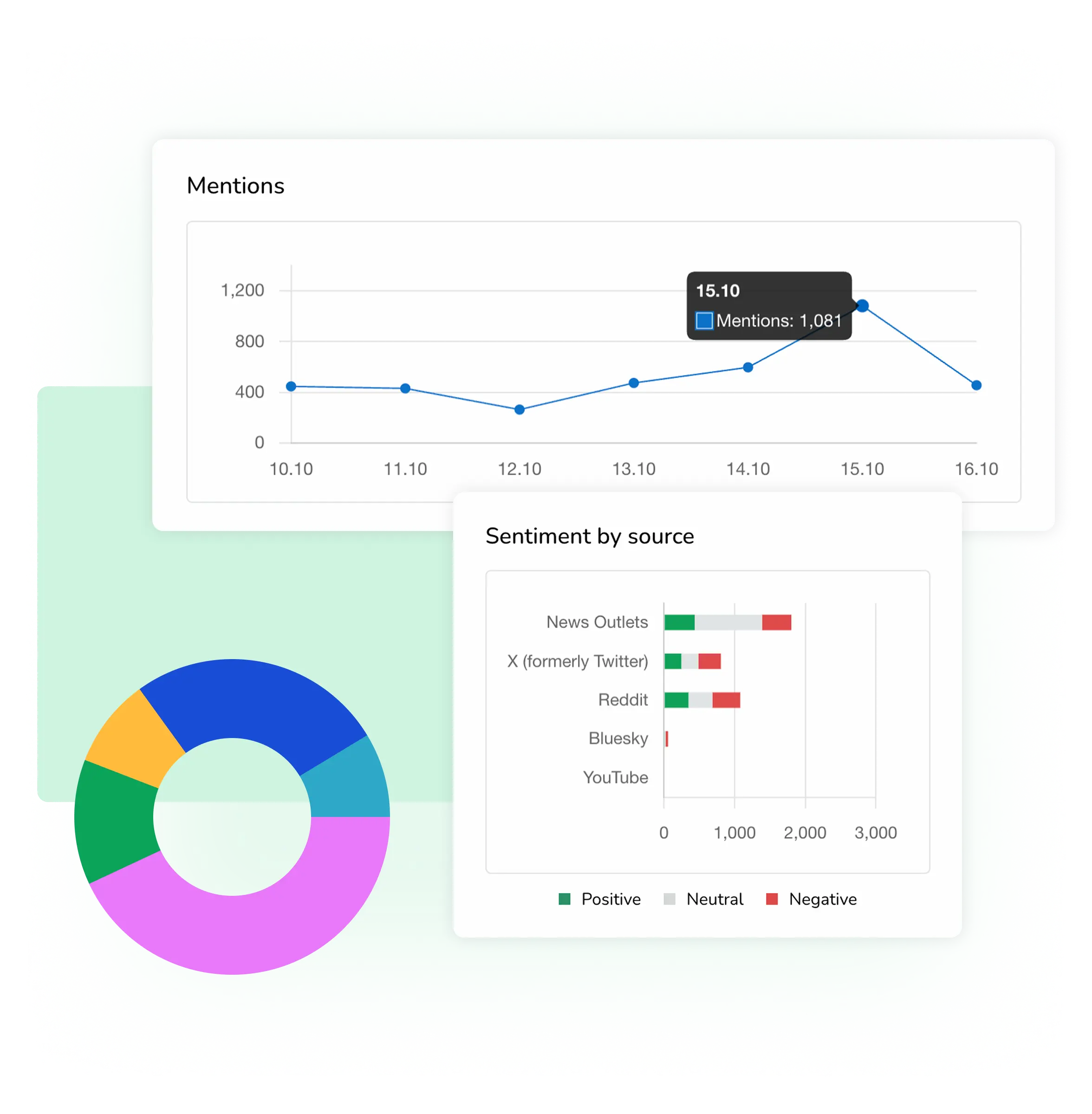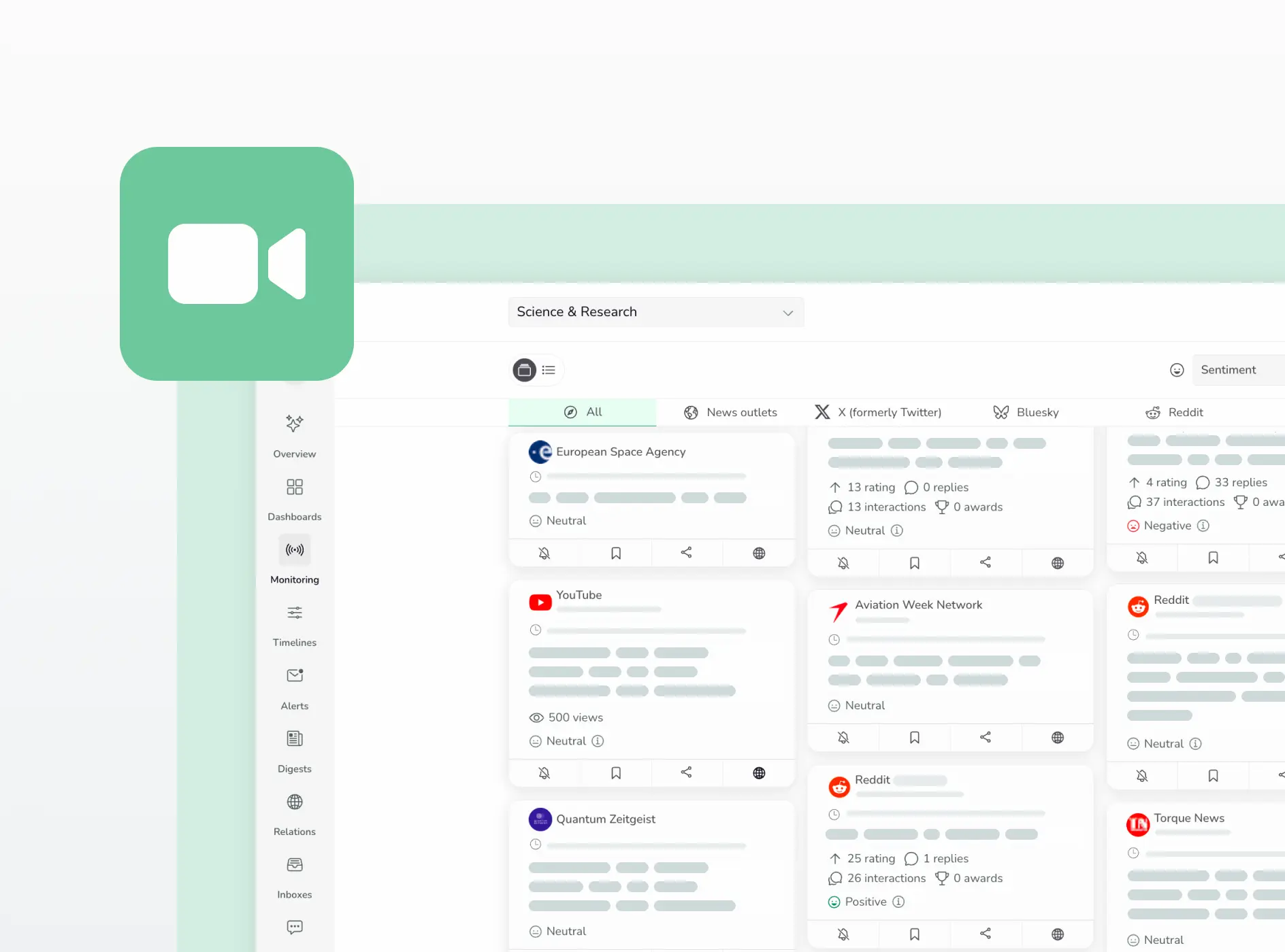 One dashboard to monitor news, track sentiment across social media platforms and uncover emerging trends.