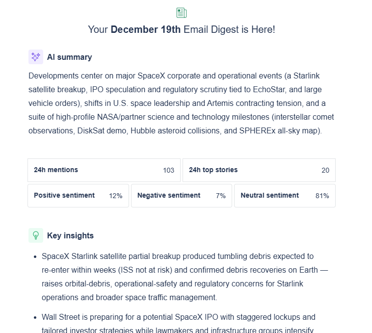 The digest contents are customizable; they can include different elements, such as an AI summary of the latest developments, analytics, key insights, or top stories overviews with links to original articles.