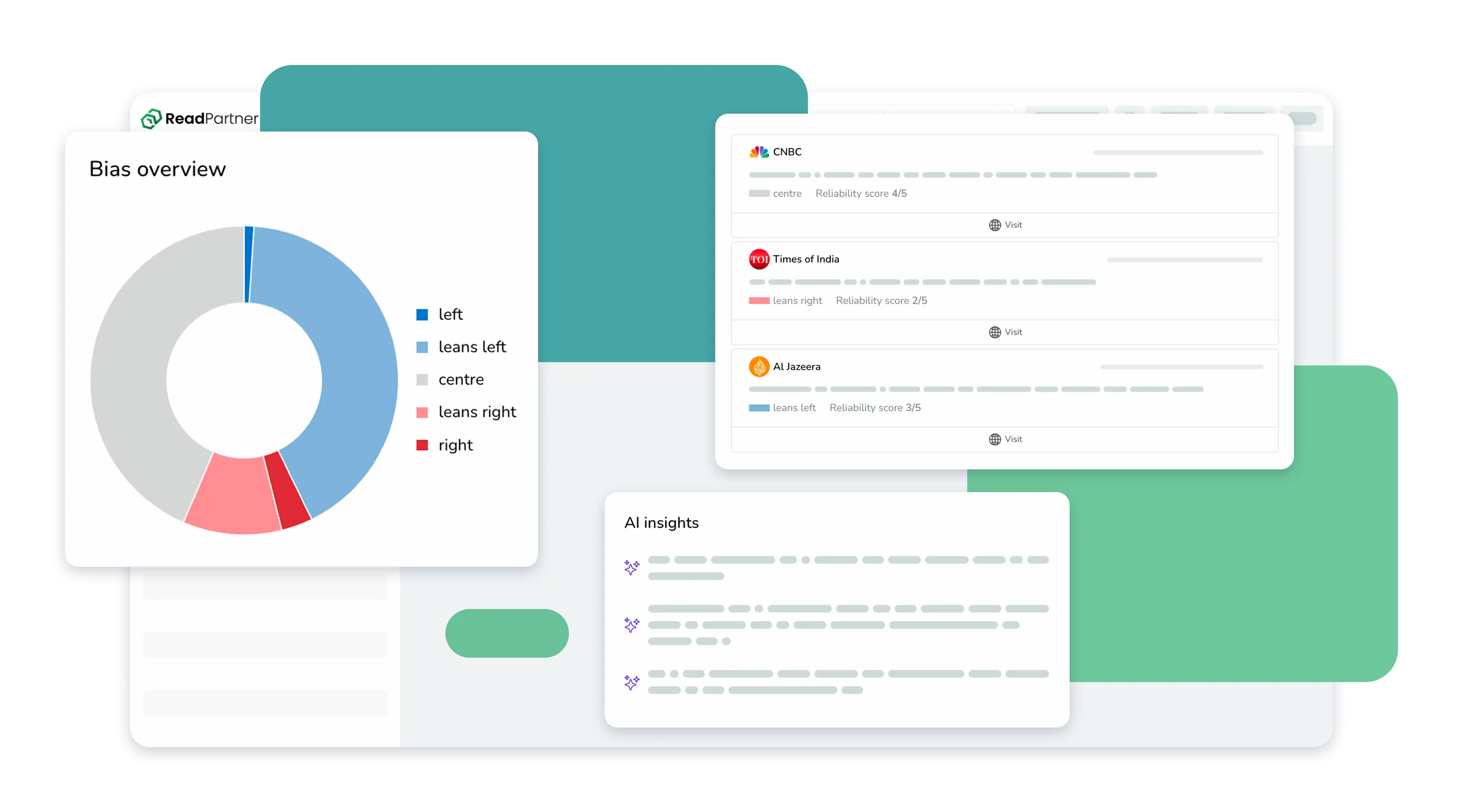 ReadPartner offers a bias detector that shows whether monitored stories and sources are left-leaning, right-leaning, or centrist. This allows teams to see patterns, identify what key points overlap, and reduce bias in the data that supports their decision-making.