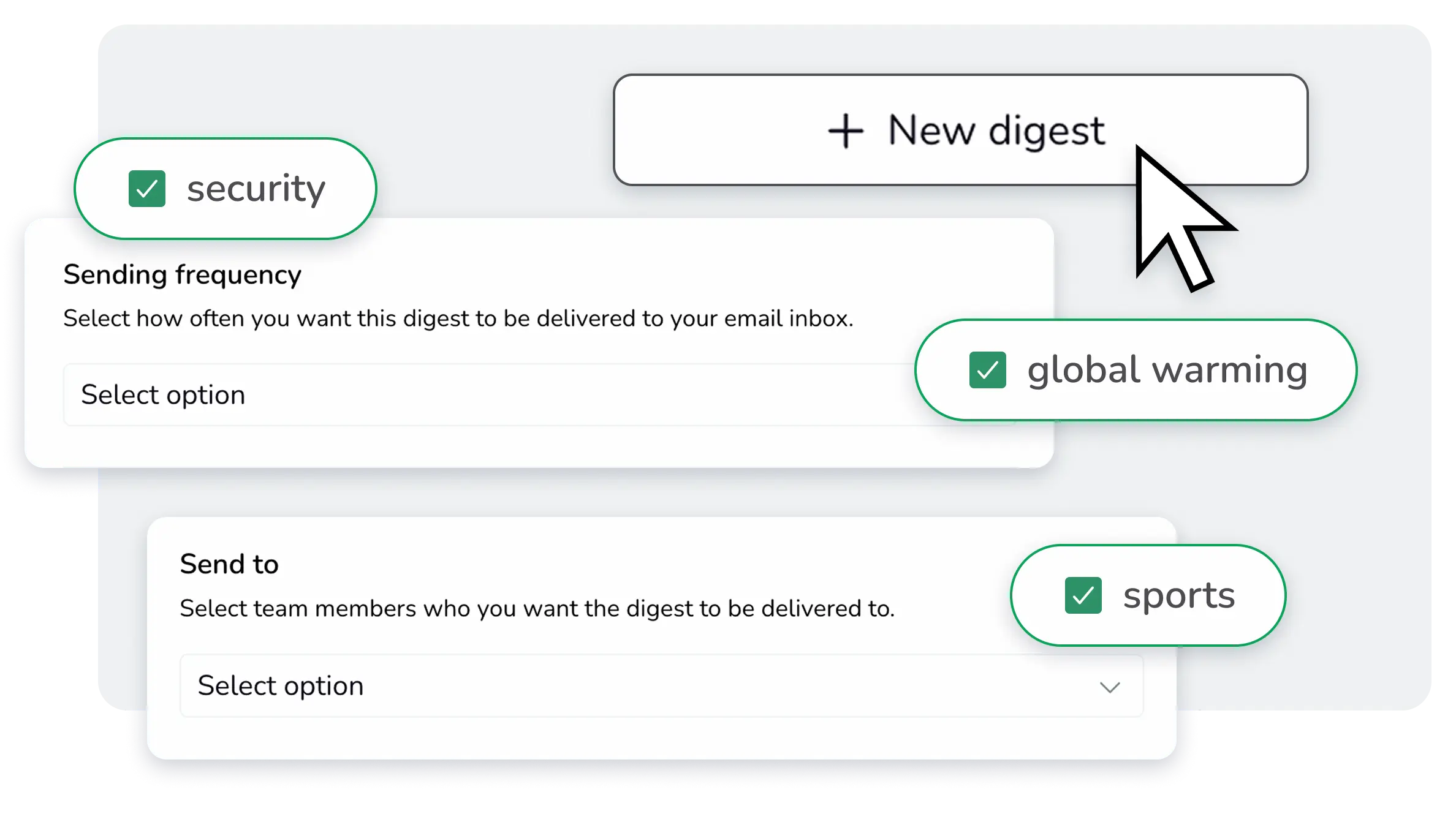 Email digests consolidate the developments over the last period into a single, concise overview that is sent out to team members you select. This saves hours of manual work on finding and summarizing the relevant information to update professionals and decision-makers, as well as ensuring everyone gets the same information, improving alignment and reducing miscommunication.