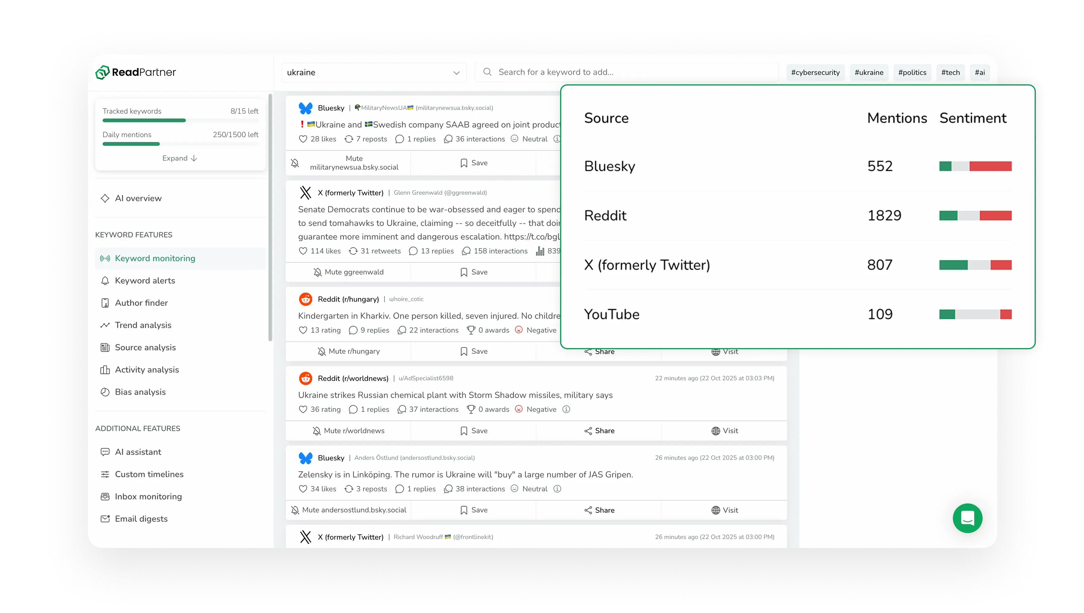 ReadPartner is a media intelligence platform which helps individuals and organizations consolidate their media monitoring, trend analysis and department briefing efforts in one modern dashboard. Professionals use ReadPartner to monitor news sources, keywords, newsletters, social media platforms and to generate executive reports, analyze keywords and create email news digests for their colleagues and management.